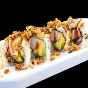 Rotolo di riso con granchio, avocado, cipolla, salsa teriyaki e salsa rosa (8 pezzi) - Piccante Allergeni: glutine, crostacei, uova, soia