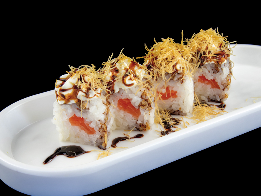 Salmone e riso con all’esterno philadelphia, pasta kataifi, salsa teriyaki (8 pezzi)