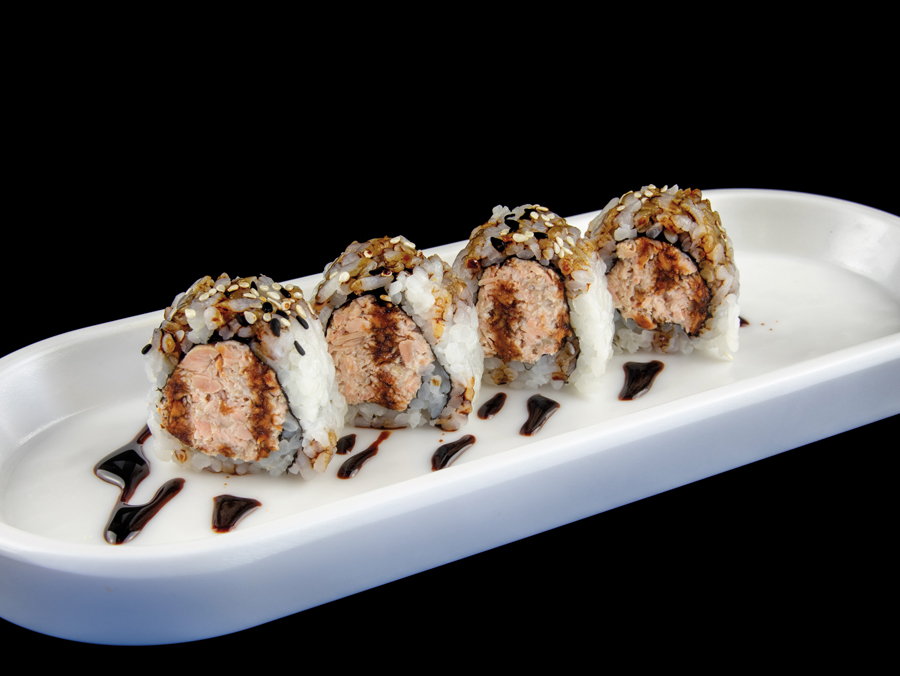 Rotolo di riso con salmone grigliato, philadelphia, sesamo, salsa teriyaki (8 pezzi)
