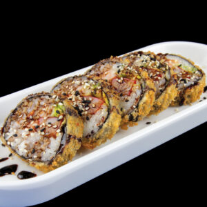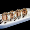 Rotolo di riso con gamberi fritti, maionese, sesamo, pasta kataifi e salsa teriyaki (8 pezzi)