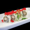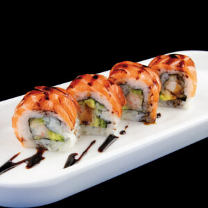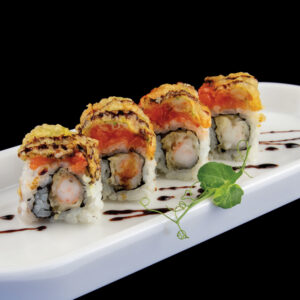 Rotolo di riso con gamberi fritti, philadelphia, con sopra spicy salmon, fiori di zucca, salsa teriyaki (8 pezzi) Allergeni: glutine, crostacei, uova, pesce, soia, lattosio, sesamo