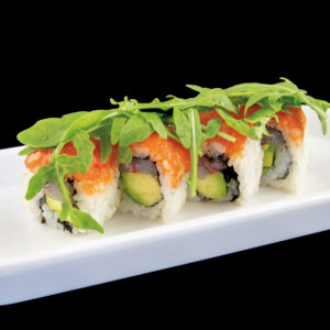 Gambero crudo, avocado, con sopra salmone e rucola (8 pezzi) Allergeni: crostacei, pesce