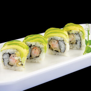 Rotolo di riso con gambero fritto, maionese, con sopra avocado e salsa teriyaki (8 pezzi) Allergeni: glutine, crostacei, uova, soia, sesamo