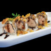 Rotolo di riso con gamberi fritti, philadelphia, con sopra spicy salmon, fiori di zucca, salsa teriyaki (8 pezzi) Allergeni: glutine, crostacei, uova, pesce, soia, lattosio, sesamo