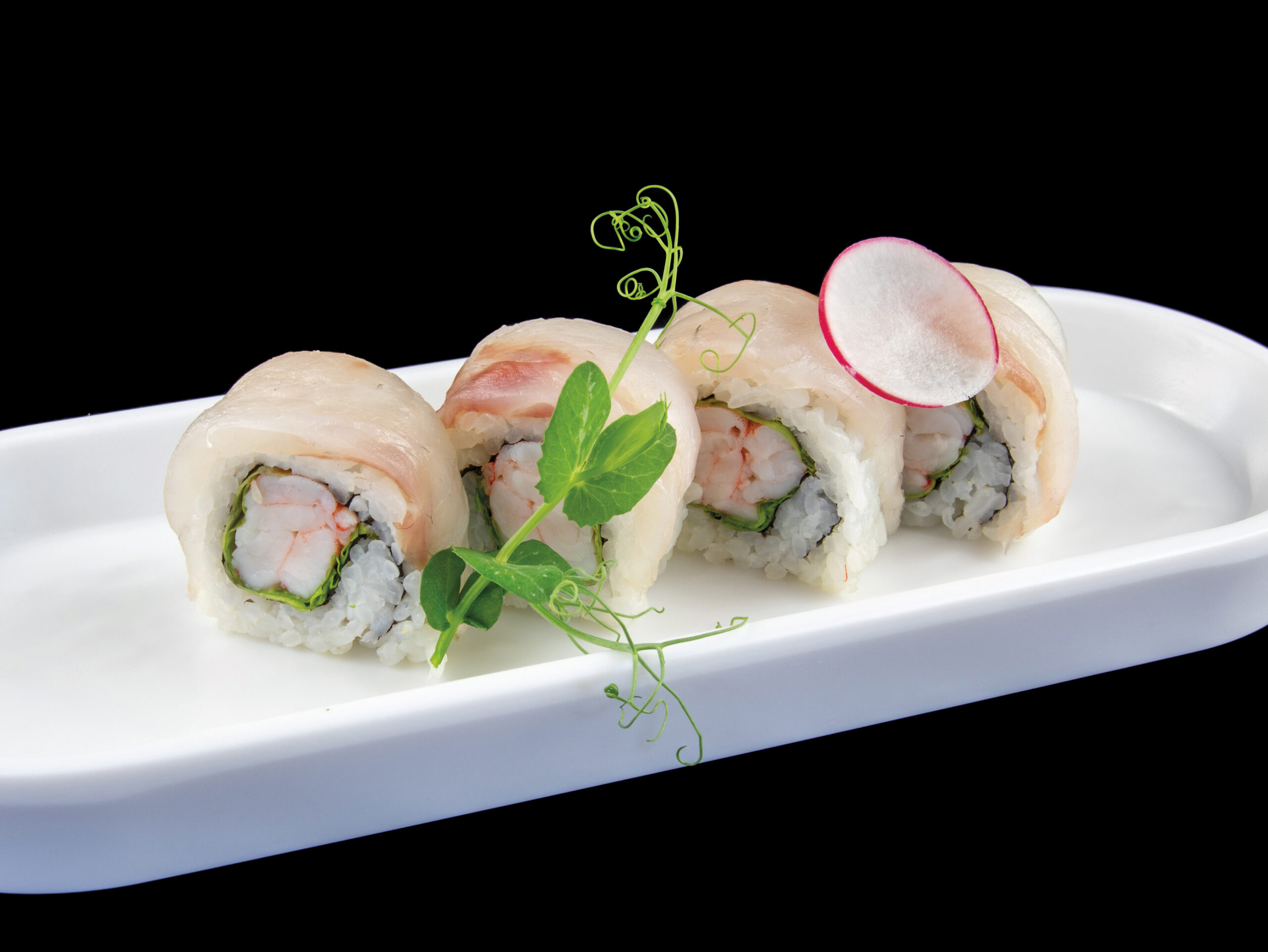 Rotolo di riso con gambero cotto, insalata, sesamo, con sopra branzino, olio di oliva (8 pezzi)