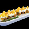 Spicy salmon, avocado, con sopra salmone scottato, pistacchi e salsa a base di crema di latte (8 pezzi) Allergeni: uova, salmone, lattosio, frutta a guscio