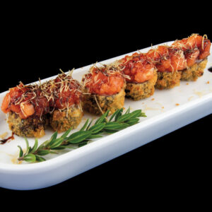 Hoso salmone fritto, sopra spicy salmon, kataifi e salsa teriyaki (6 pezzi) Allergeni: glutine, uova, pesce, soia