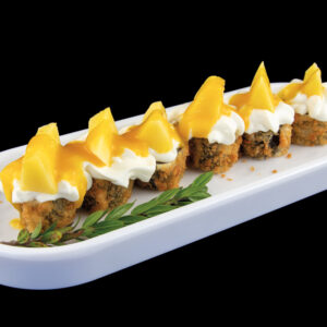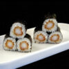 Hoso salmone fritto, sopra philadelphia, mango e salsa mango (6 pezzi) Allergeni: glutine, pesce, lattosio