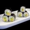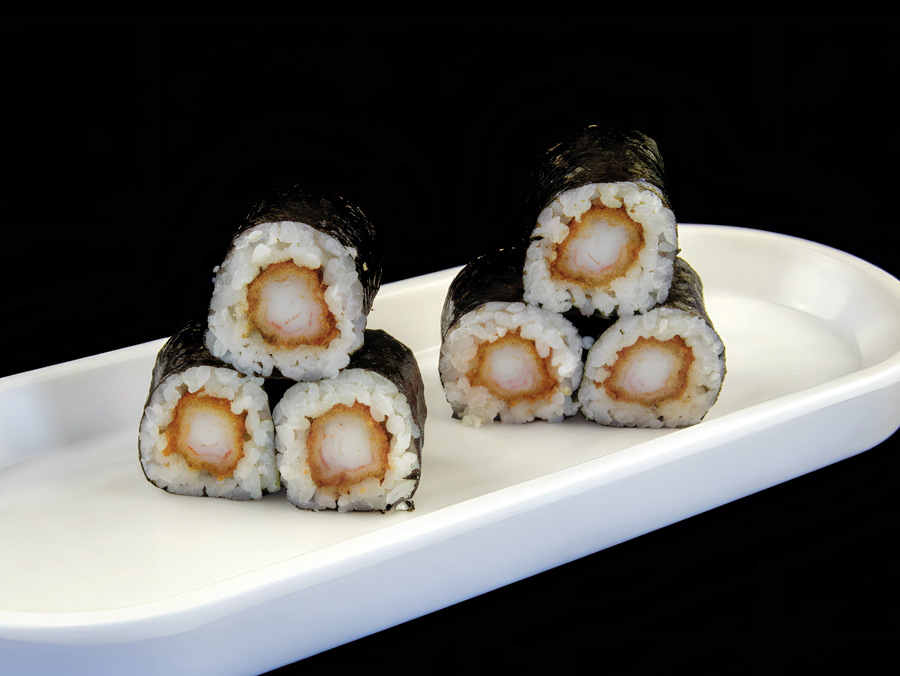 Rotolo di riso con gambero cotto, insalata, sesamo, con sopra branzino, olio di oliva (8 pezzi) Allergeni: crostacei, pesce, sesamo