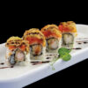 Rotolo di riso con fiori di zucca, philadelphia, con sopra spicy salmone, salsa teriyaki (8 pezzi) – Piccante