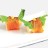 Rucola, mango avvolto da salmone con salsa yuzu (4 pezzi) Allergeni: pesce, soia