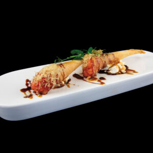 Cono di sfoglia di soia con salmone piccante, philadelphia (piccante) Allergeni: glutine, uova, pesce, soia, latte