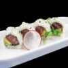 Rucola, mango avvolto da salmone con salsa yuzu (4 pezzi) Allergeni: pesce, soia