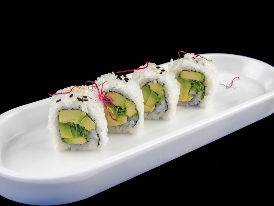 Rotolo di riso con avocado, insalata, alghe piccanti, sesamo (8 pezzi) Allergeni: glutine, sesamo