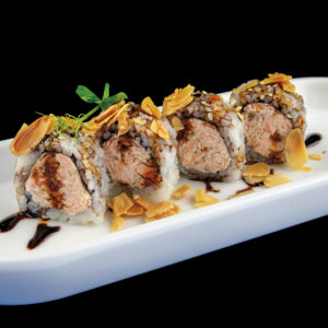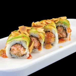 Rotolo di riso con salmone fritto, con sopra avocado, scaglie di mandorle e salsa agrodolce (8 pezzi) Allergeni: glutine, pesce, frutta a guscio