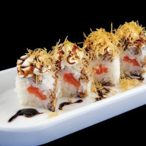 Salmone e riso con all’esterno philadelphia, pasta kataifi, salsa teriyaki (8 pezzi) Allergeni: glutine, pesce, lattosio, soia