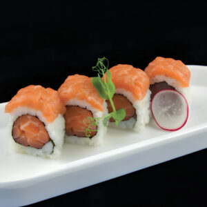 Rotolo di riso con salmone, philadelphia, avocado e sesamo (8 pezzi) Allergeni: pesce, lattosio, sesamo