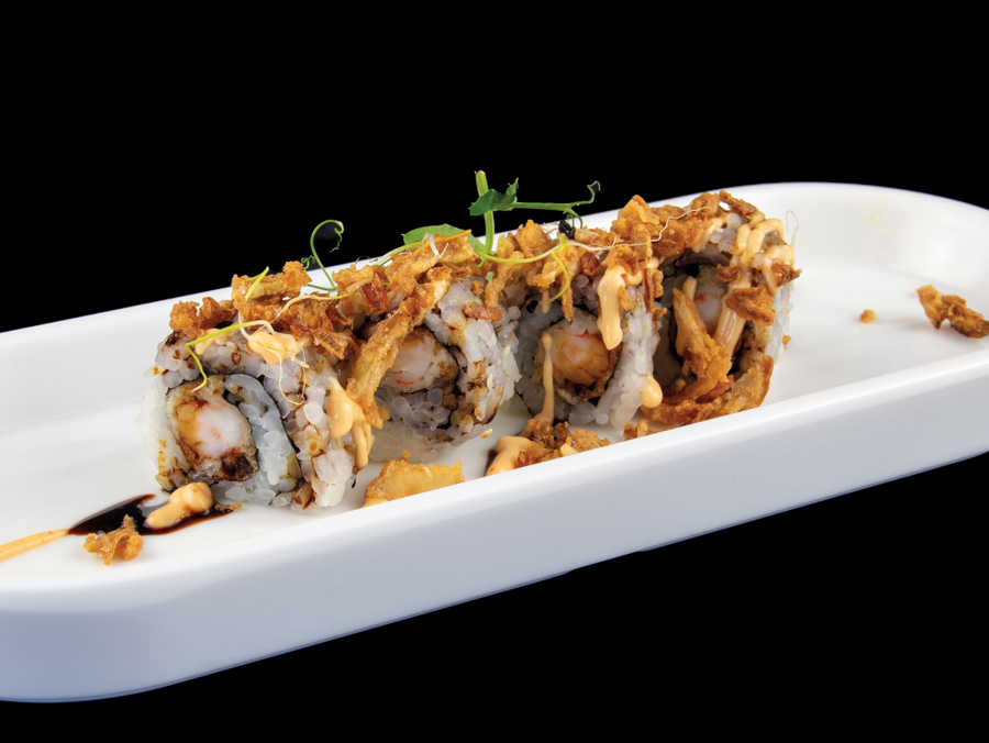 Rotolo di riso con gambero fritto con sopra cipolle croccanti, maionese e teriyaki (8 pezzi)