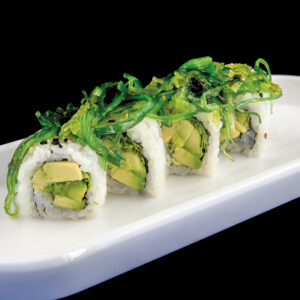 Rotolo di riso con avocado, insalata, alghe piccanti, sesamo (8 pezzi) Allergeni: glutine, sesamo