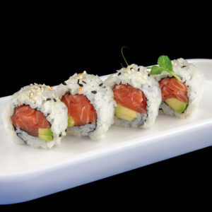 Rotolo di riso con salmone, avocado, sesamo (8 pezzi) Allergeni: pesce, sesamo