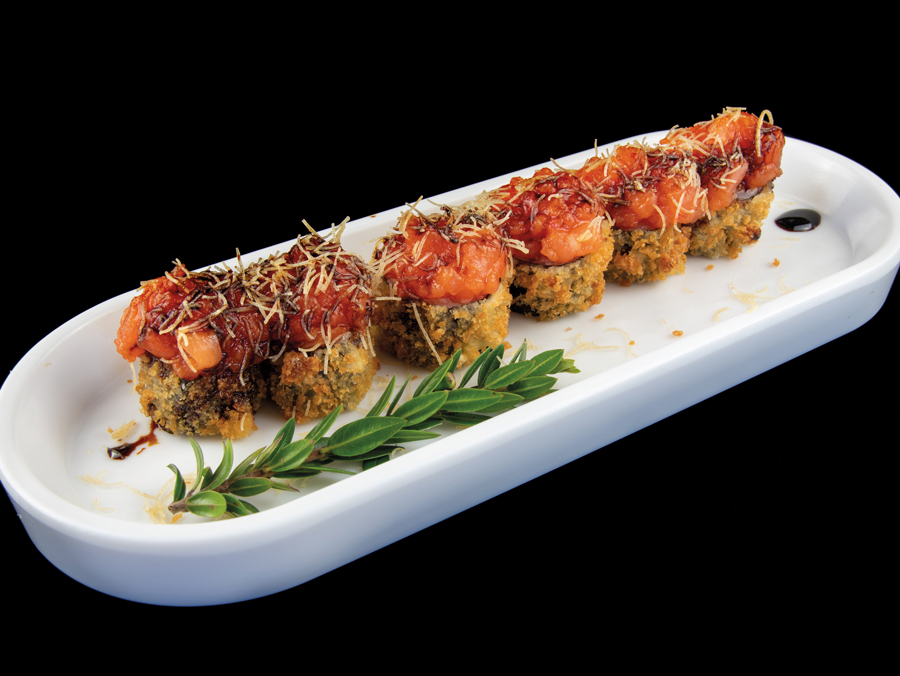 Hoso salmone fritto, sopra spicy salmon, kataifi e salsa teriyaki (6 pezzi)