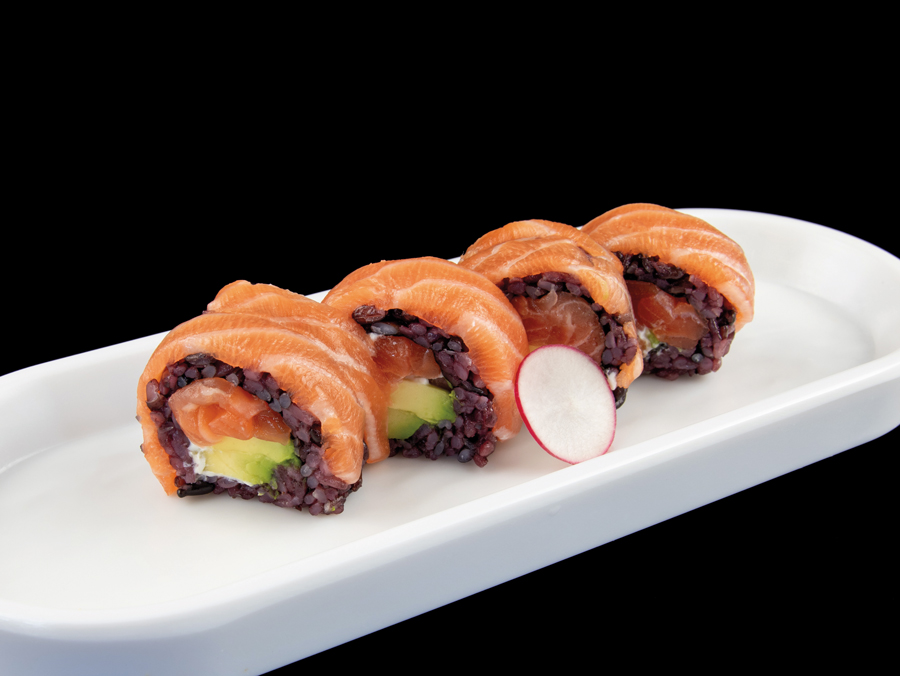 Rotolo di riso venere con salmone, avocado e philadelphia con sopra salmone (8 pezzi)