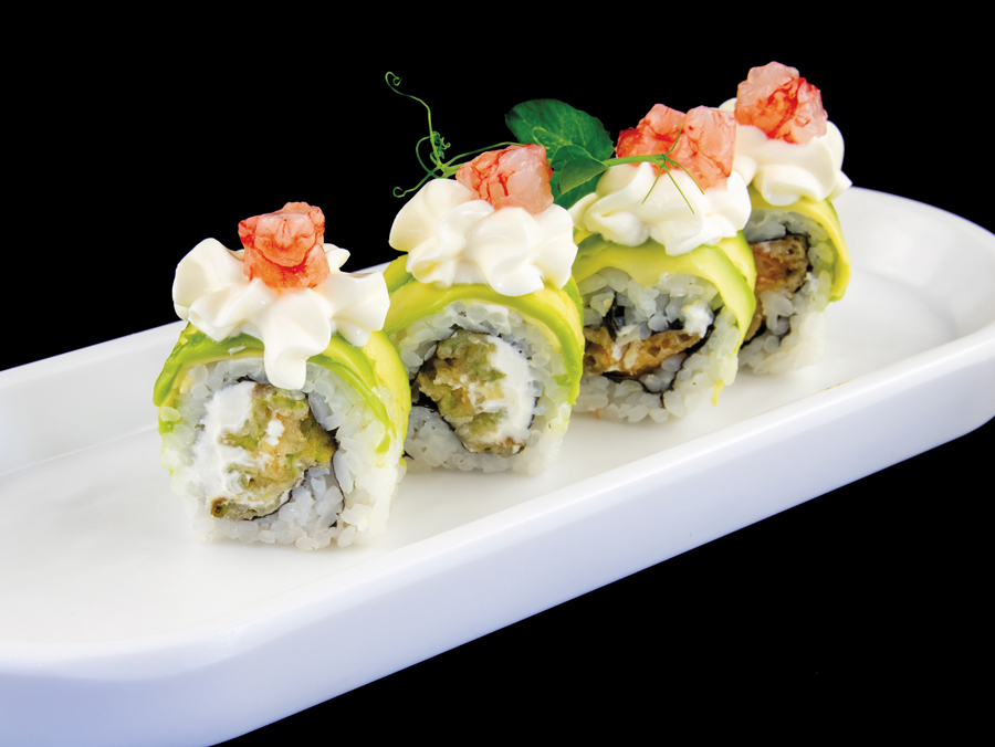 Rotolo di riso con gambero fritto, maionese, con sopra avocado e salsa teriyaki (8 pezzi) Allergeni: glutine, crostacei, uova, soia, sesamo