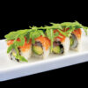 Rucola, mango avvolto da salmone con salsa yuzu (4 pezzi) Allergeni: pesce, soia