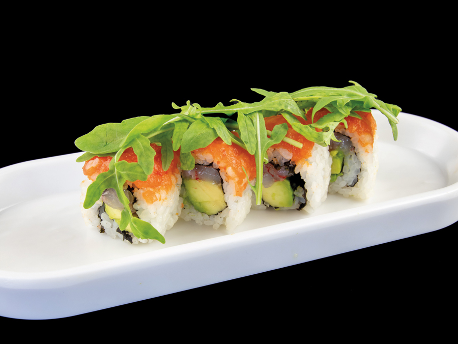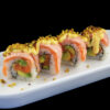Rotolo di riso con salmone, avocado, surimi fritto, gambero fritto, sesamo e salsa teriyaki (8 pezzi) Allergeni: glutine, pesce, crostacei, sesamo, soia