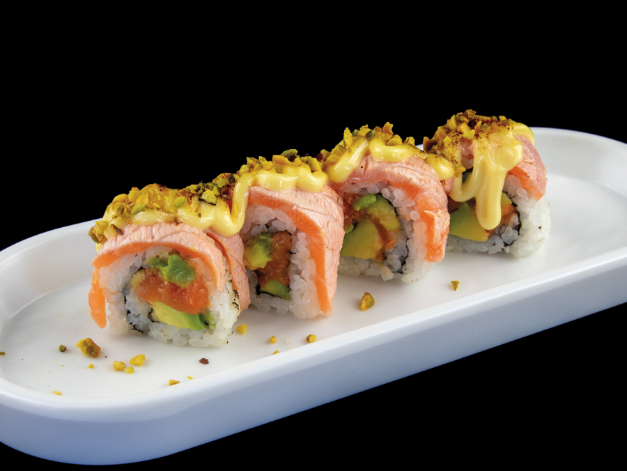 Spicy salmon, avocado, con sopra salmone scottato, pistacchi e salsa a base di crema di latte (8 pezzi)