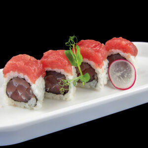Rotolo di riso con tartare di tonno, salsa piccante, tobiko e sesamo (8 pezzi) - Piccante Allergeni: pesce, uova, sesamo