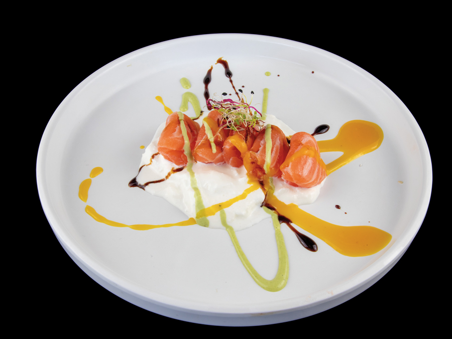 Salmone tagliato a cubetti in salsa ponzu e sesamo Allergeni: glutine, pesce, soia, sesamo