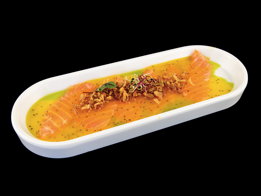 Carpaccio di salmone con salsa mango e cipolla fritta