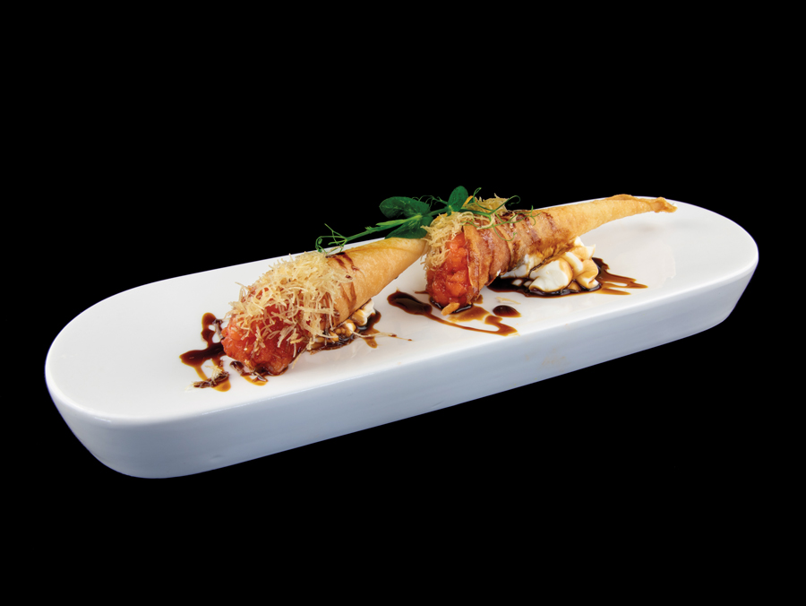 Bignè di riso avvolti da salmone con philadelphia, cipolla fritta e salsa teriyaki (3 pezzi) Allergeni: glutine, pesce, lattosio, soia