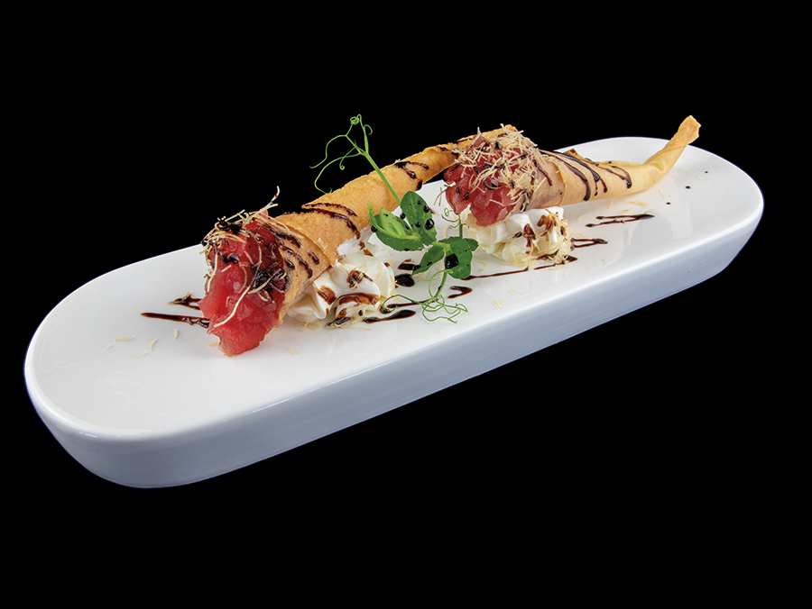 Sfoglietta croccante con salmone spicy, philadelphia, salsa teriyaki e salsa rosa (3 pezzi) Allergeni: glutine, pesce, soia, lattosio, uova